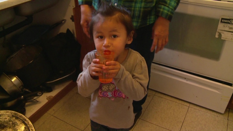 Three and a half year-old Hailey Sakanee takes a sip of water. Her community, Neskantaga First Nation, has been under a water advisory for two decades. (CBC)